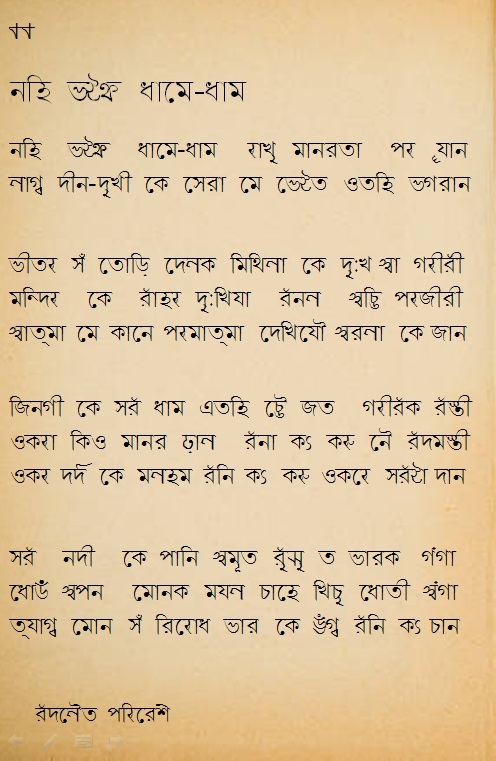देवनागरी आ मिथिलाक्षर (तिरहुता) दुनु लिपि मे प्रकाशित कृति ‘बदलैत परिवेश’ गीति संग्रह सँ साभार, प्रकाशन वर्ष : वि.सं. २०७३ साल, प्रकाशिका : कालीन्दी ठाकुर